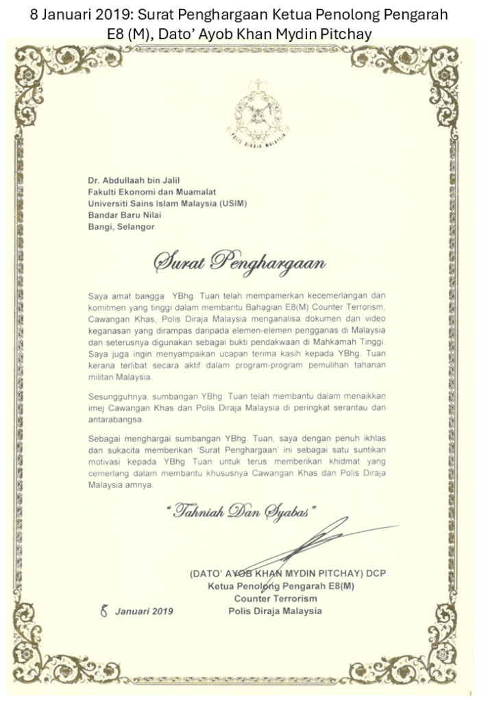 8 Januari 2019: Surat Penghargaan Ketua Penolong Pengarah E8 (M), Dato’ Ayob Khan Mydin Pitchay.